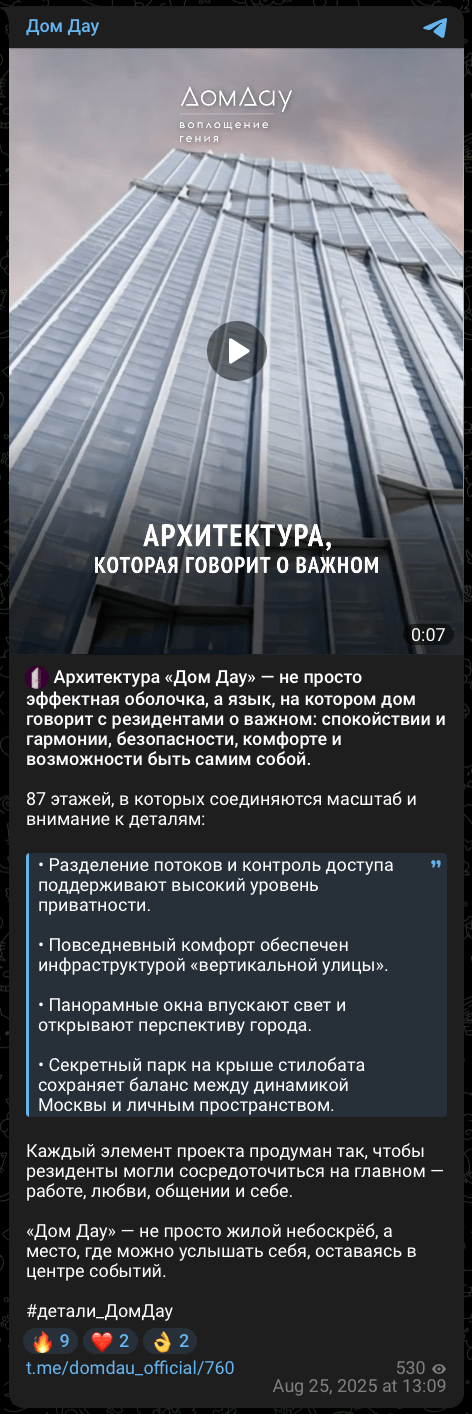 Премиальная недвижимость не требует шума — но требует вкуса, поэтому ролики в высоком сегменте и должны демонстрировать стиль и эстетику. Игры с хайповыми темами или мемами противоречат ДНК таких брендов.