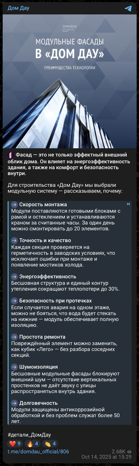 SMM — это более продолжительная, регулярная коммуникация, чем буклет или сайт, поэтому у нас есть возможность раскрыть многие подробности. Когда у девелопера становится больше проектов, появляется и много тем. Но я считаю, пока проект всего один — это прекрасное время: вы можете раскрыть его в деталях.
