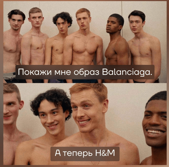 Проблема. Есть мнение, что покупатель премиальных товаров — особенный, и для него нужно особенно вести соцсети. Об этом — мем из фильма «Треугольник печали», когда модели для фотографа показывают то дорогой бренд — с холодным и высокомерным лицом, то бюджетный — дружелюбно и радостно.
